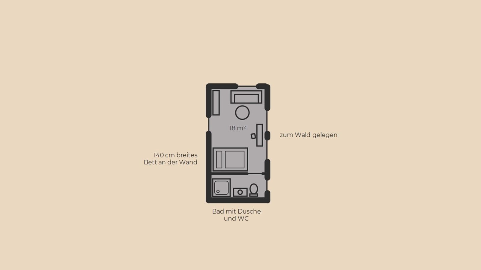 für 1 Person | zum Wald gelegenes Nordzimmer | 1,40 m breites Bett an der Wand | Bad mit Dusche, WC | Holzboden