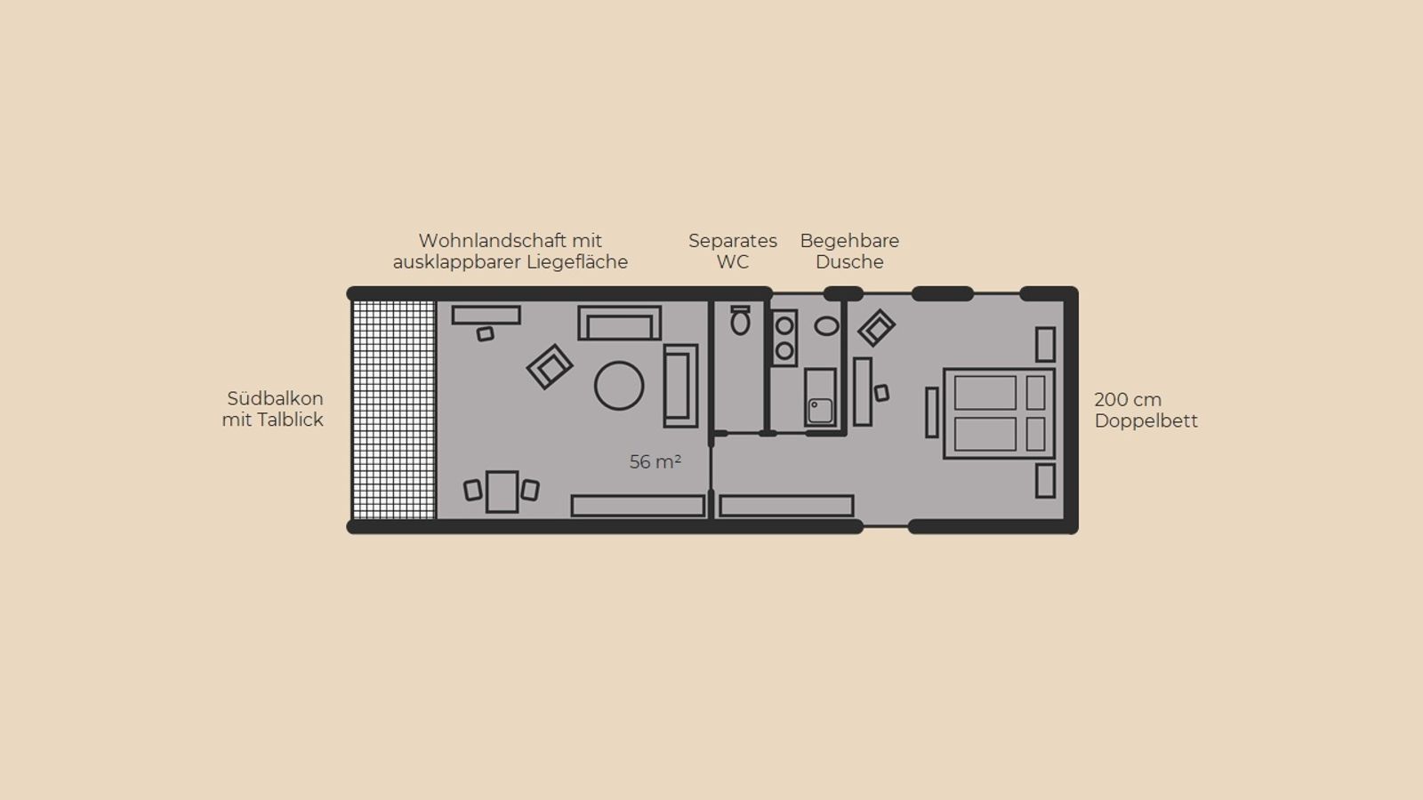 für 2 bis 4 Personen | Südbalkon mit Talblick 2,00 m Doppelbett | separates Wohnzimmer mit Wohnlandschaft mit Liegefläche ausklappbar (1,55 m) | Bad mit begehbarer Dusche, Bidet, separates WC | Holzboden