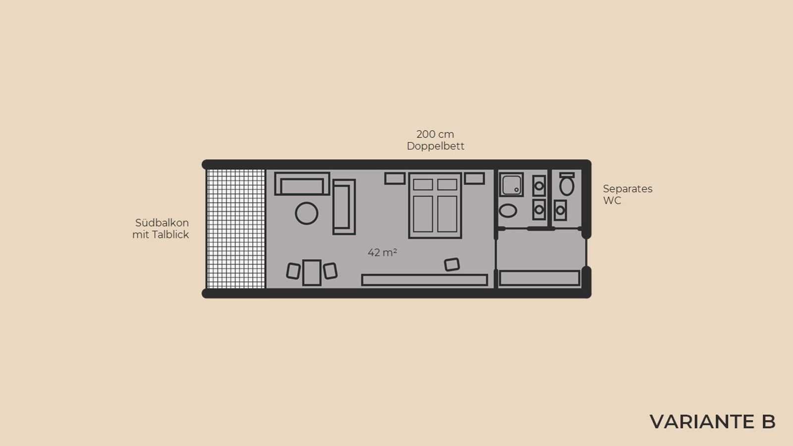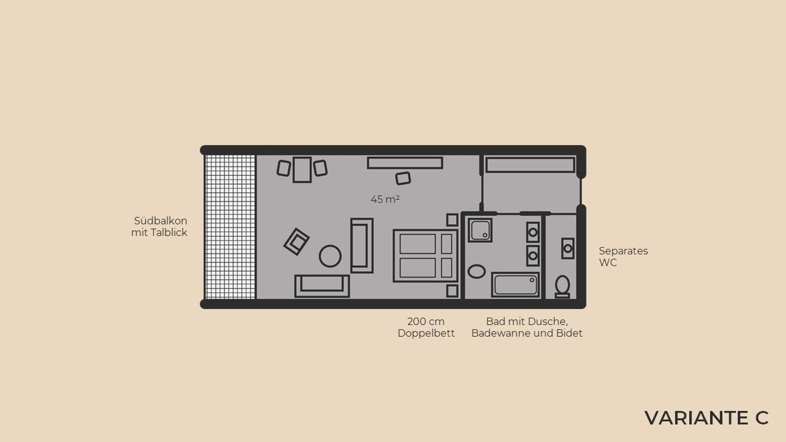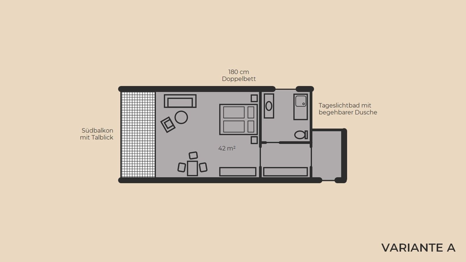für 2 Personen | Südbalkon mit Talblick 1,80 bzw. 2,00 m Doppelbett | Bad mit Dusche, teilweise mit Badewanne und Bidet, großteils separates WC | Holzboden